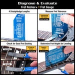 Feilsøk og sjekk båndene med Fret Rocker og Fret Gauge, fiks eventuelle feil på individuelle bånd med de tre U-filene. Skal båndene krones følger det også med en kronefil som er utformet slik at du ikke overfiler. Hvis båndendene er skarpe, kan du enkelt fikse det med Fret End Dressing-filen og Fret Beveling-filen designet slik at den har de perfekte vinklene, 3 og 23 grader. For siste touch på båndene brukes MusicNomads Tracers Polishing-filer som gir den ultimate overflaten og glansen til båndene.