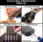 Bonusfunksjoner inkluderer: laseretsede størrelser på hver skiftenøkkel, 3 magnetiserte skrutrekkere for små truss-rod-dekselskruer og pipenøkkelen og verktøyet Spoke Wheel skyves inn i Music Nomads Octopus-håndtak (selges separat) for ekstra kraft og komfort.