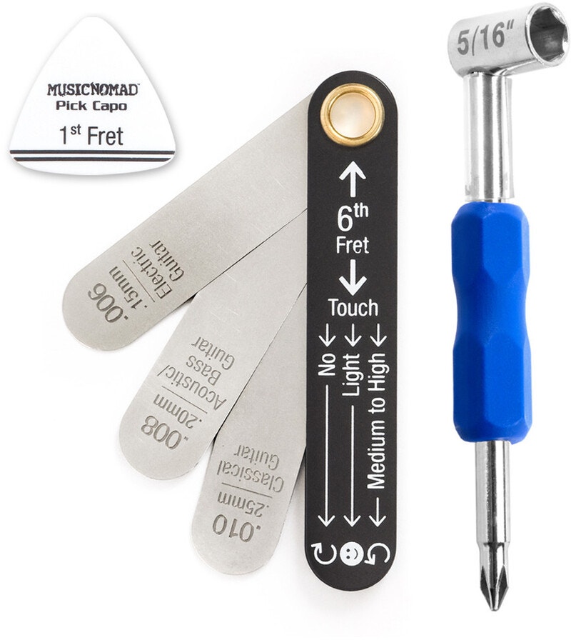 For enkelt å justere halsen på din Gibson og amerikanskproduserte PRS-gitar, har MusicNomad produsert et sett med trekkstangnøkkel og målesett. Målesettet kommer med de vanligste avlastningsmålingene for elektriske, akustiske gitarer og også for elektriske basser, spesielt for Gibson og PRS anbefales generelt .006" mål. Trekknøkkelen er designet for å passe PRS og Gibson eller andre instrumenter der draghodet er 5/16" og hvor halsen justeres ved hodet. I den andre enden av trekkstangnøkkelen finner du en hendig magnetisk stjerneskrutrekker, perfekt for å fjerne trekkstangdekselet.