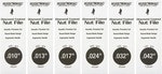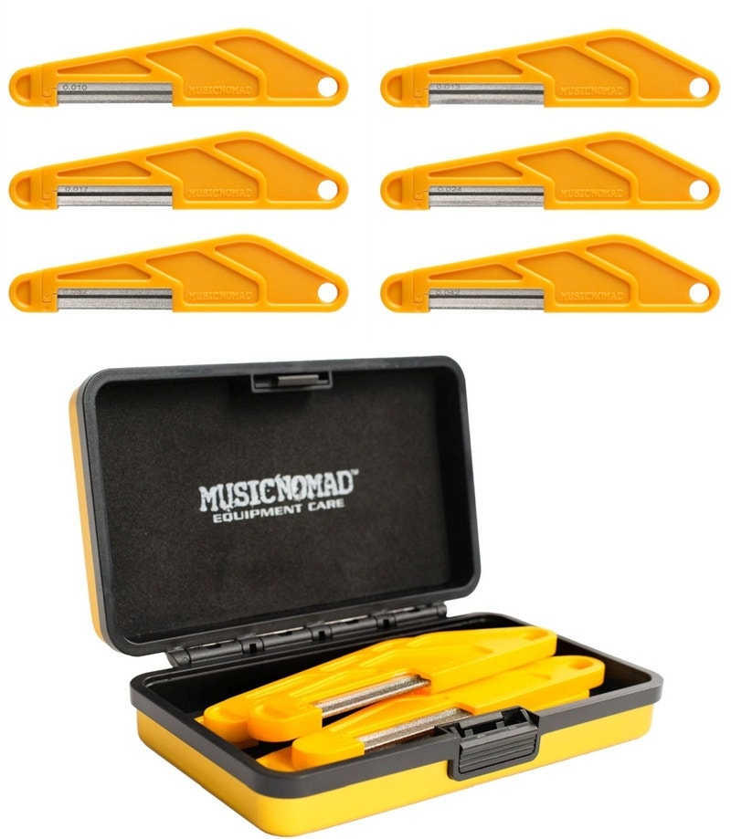 MusicNomads patentsøkte Nut Files har et revolusjonerende diamantbelegg og rund "strengformet" bladdesign som resulterer i jevne, presise kutt. De kutter og polerer spor samtidig og drifter ikke som vanlige tannfiler. Det industrielle, jevne diamantbelegget kutter og polerer alle de vanligste oversadelmaterialene som nylon, bein, grafitt og TUSQ. De fungerer til og med fantastisk på stoler. Vi har lagt til et ergonomisk håndtak for total komfort og kontroll over kuttet ditt, eller du kan fjerne bladet fra håndtaket som et alternativt kuttealternativ. Dette tilpassede settet kommer med 6 stk oversadelfiler i forskjellige størrelser for el-gitar, Super Light Strings. Vi inkluderer til og med en kompakt, sterk aluminiumskasse. Det er MusicNomad-kvalitet – hever standarden innen utstyrspleie.