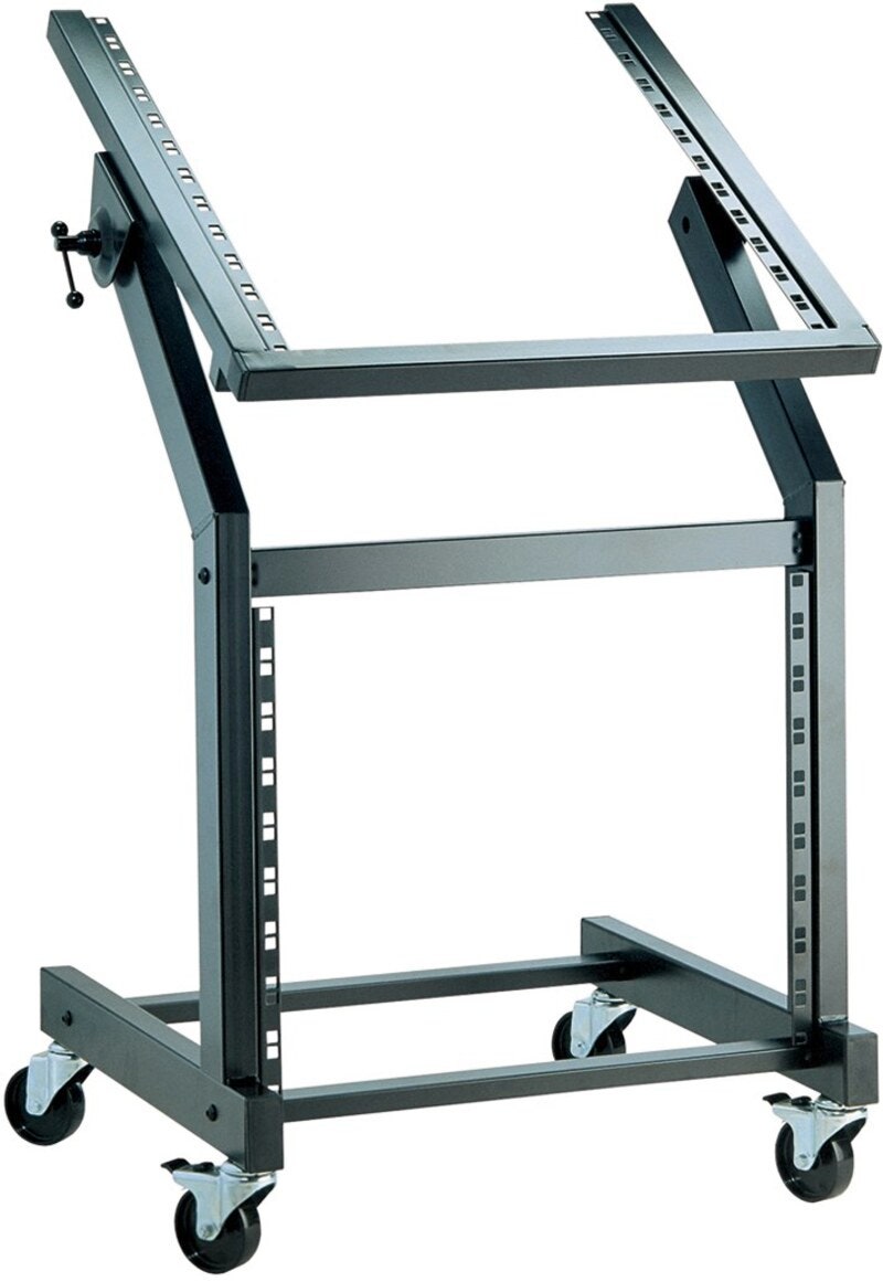 Rackvogn med topp som kan vinkles og låsbare hjul. 9 HE foran, 12 HE oppå. Inklusiv rackmuttere.