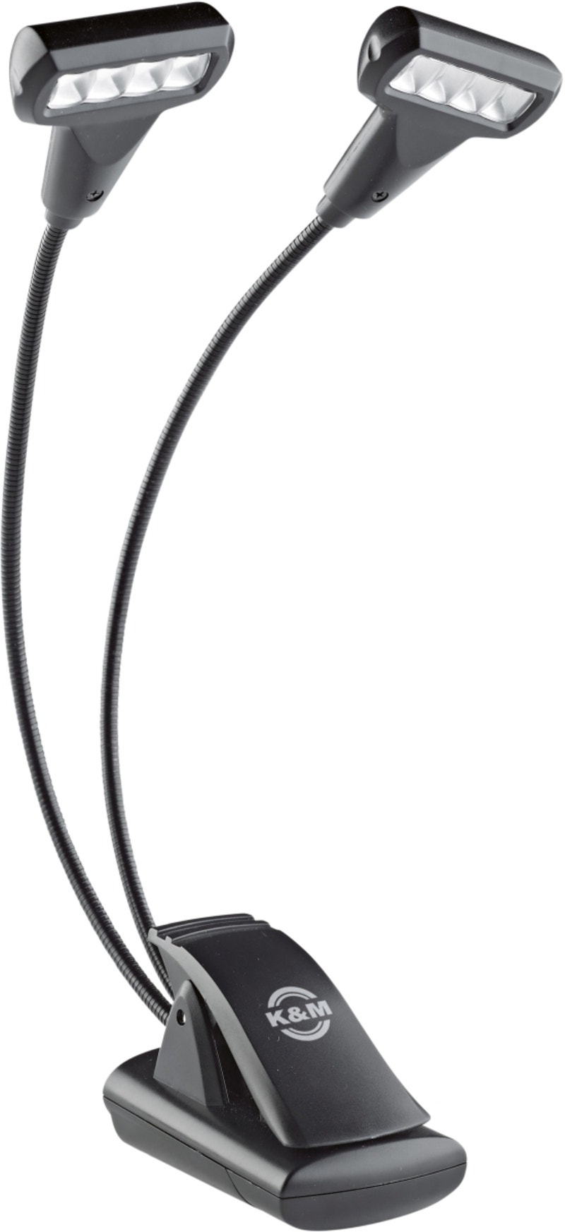 König & Meyer Music stand light "Double 4LED T-Mod flx" er en batteridrevet LED-belysning som drives med batterier eller nettdapter (medfølger ikke). Du kan klemme den fast på materialer med en tykkelse opp til 25mm eller sette den på et bord hvis du vil ha den frittstående. Passer bra til notstativ eller på et instrument, men også perfekt å feste på en bok når du vil lese i mørket.
