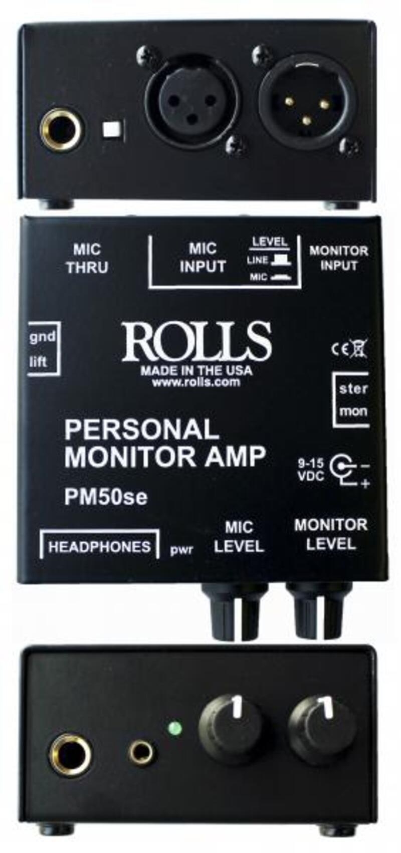 The PM50se mixes a stereo or mono line-level Monitor signal with a microphone or line level XLR signal to a set of headphones. It has a monitor level control, mic/XLR level control, mic/line pass through XLR jack, two headphone output jacks, and a stereo or mono TRS or TS 1/4" monitor input jack. Possible users may be drummers who need to hear a click track, choir singers who need to hear themselves, podcast, recording or many other applications. The power adapter is included.