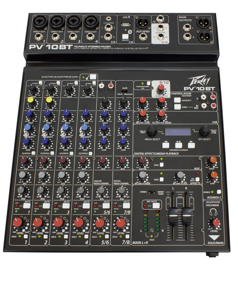 PV 10 BT inkluderer 4 kanaler med reference-kvalitet mikrofonsforforsterkere, 4 direkte utganger for innspillinger, en stereo kanal, media kanal med Bluetooth®-trådløs inngang, digitale effekter av høy kvalitet med LCD-skjerm, USB-utgang for streaming, MP3-avspilling via USB A-inngang, Peaveys eksklusive Kosmos®-lydforbedring, fantomkraft på 48 volt, to valgfrie kontrollromutganger, 2 kanaler med komprimering, én kanal med innebygd valgbar gitarforforsterker, EQ med 3 bånd per kanal med bypass, mute-knapper for kanaler, aux-sending, indikatorer for signalklipp, og en stereo master LED-måler. Denne utrolig allsidige mikseren passer både i studio og i live-situasjoner.