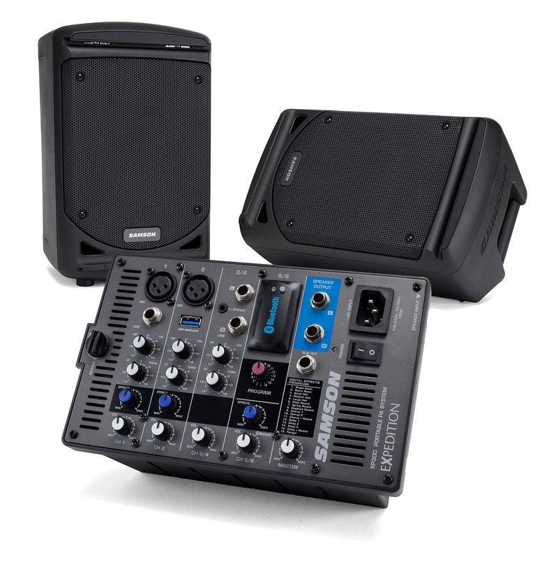 Samsons Expedition XP300 er et alt-i-ett lydsystem som tilbyr utmerket lydkvalitet med rask og enkel installasjon. XP300 har en lett 6-kanals mikser og to 6-tommers høyttalere. For ekstra portabilitet har XP300 en unik høyttalerlåsende design som gjør at systemet og alle komponentene kan pakkes ut og transporteres som én enhet.