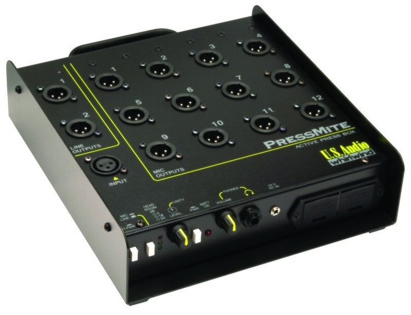 Batteridrevet aktiv pressboks. 1 mik / line-utgang med 18V fantommating, 12 trafoisolert mikrofonutganger, 2 tapeutganger, hodetelefonutgang samt indikering for batteristatus.