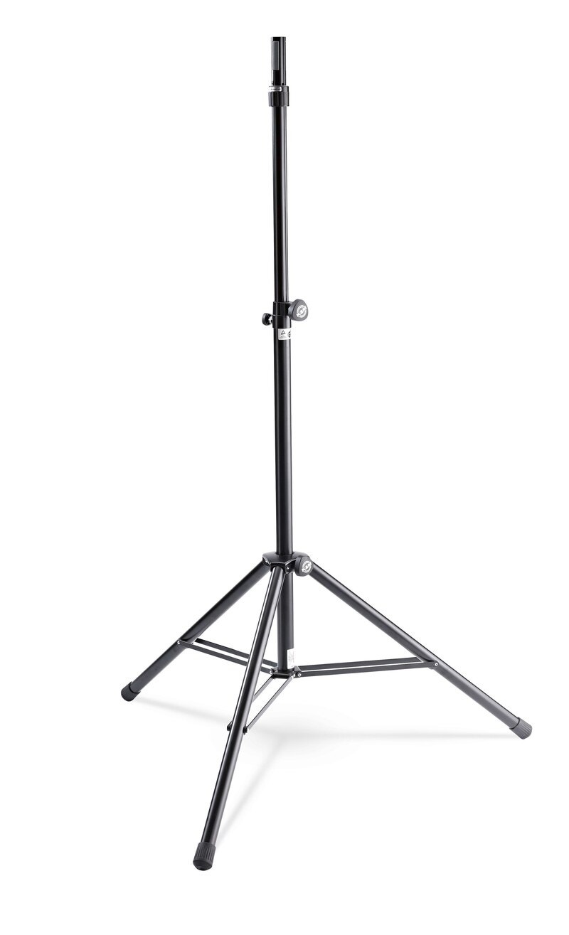 Sort høyttalerstativ i aluminium. Stativrøret er av stål og har en ekspanderbar topp med ringlås som gir stødig feste for høyttaleren.