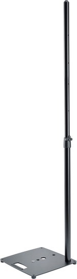 Elegant høyttalerstativ med flat stativfot (406 x 406 mm) samt bærehåndtak og innebygd kabelhåndtering. Stativet er ideelt for bruk der det er begrenset plass. Avhengig av kravene er det tre måter å plassere stativstangen på. I tillegg til sentrert og off-senter posisjon, kan stativstangen også monteres i hjørnene på stativfoten. Høyde mellom 1110 og 1810 mm og kan justeres i 4 trinn à 175 mm. Maksimal lastekapasitet er 18 kg.