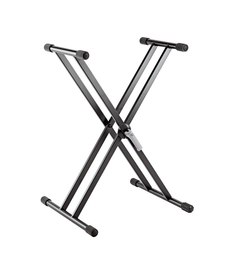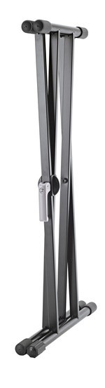This X-stand made of aluminium is lightweight and yet extremely stable. The arrangement of the double-braced stand tubes provides noticeably more stability and safety. The ergonomic clamping lever allows a quick and easy mounting or folding in no time at all. The sturdy metal joint is finely interlocked and adjustable in 5° steps enabling several different positions. With the help of a scale you can quickly find your preferred position again. The two rear rubber pads can be moved axially and can therefore be perfectly adapted to the width of the keyboard. The maximum tray depth is 350 mm. The typical quality features of K&M such as solid workmanship, high-quality finish and an adjustable rubber end cap for uneven floors complete the overall concept. The attachment 18941 offers the possibility to extend the stand for a second keyboard.