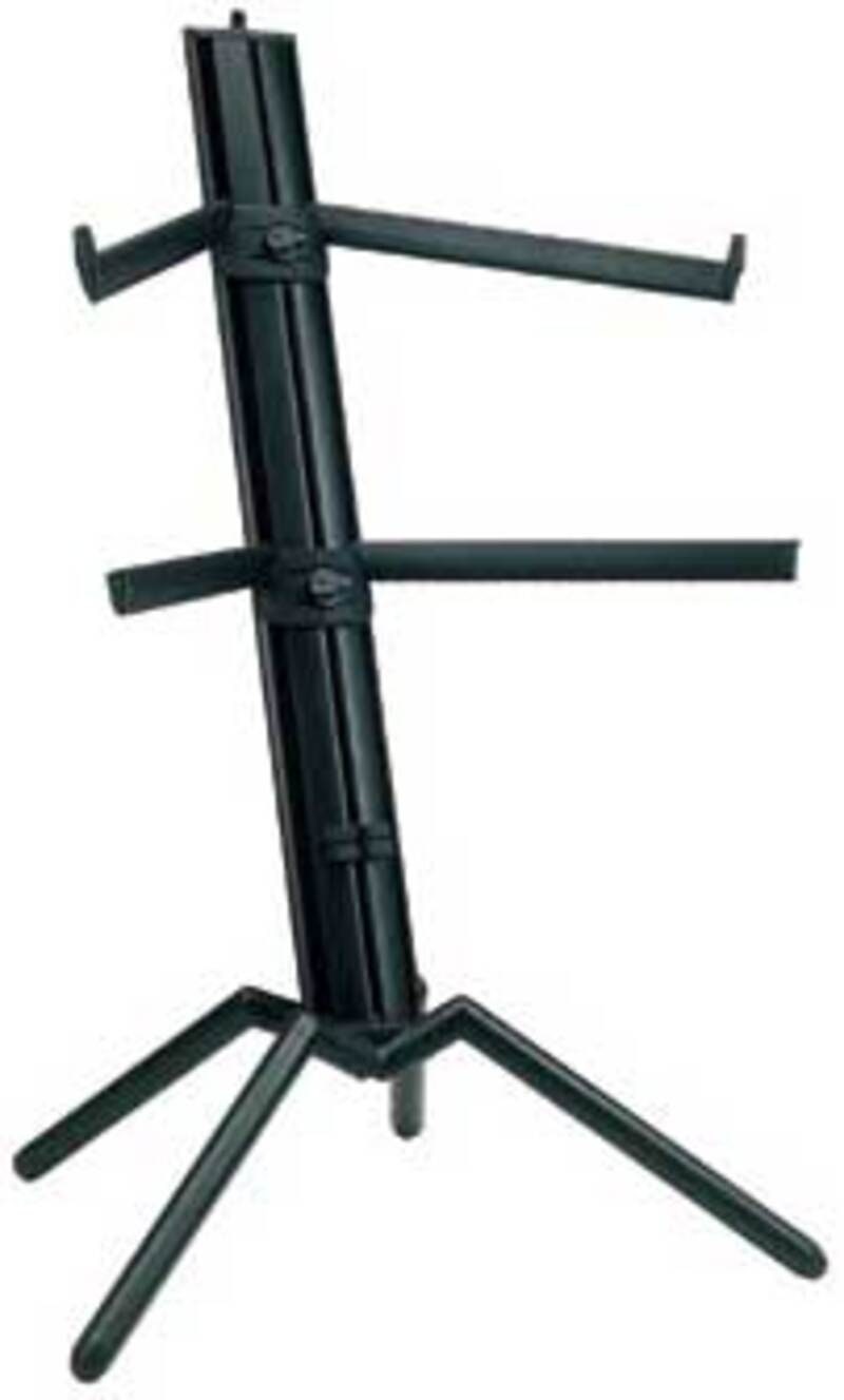 Moderne keyboardstativ med 2 sammenleggbare hyller med justerbar lengde. En videreutvikling av Spider med øvre hyllestripe vinklet for forbedret spill med 2 keyboards. Fremstilt i aluminium. Svart.