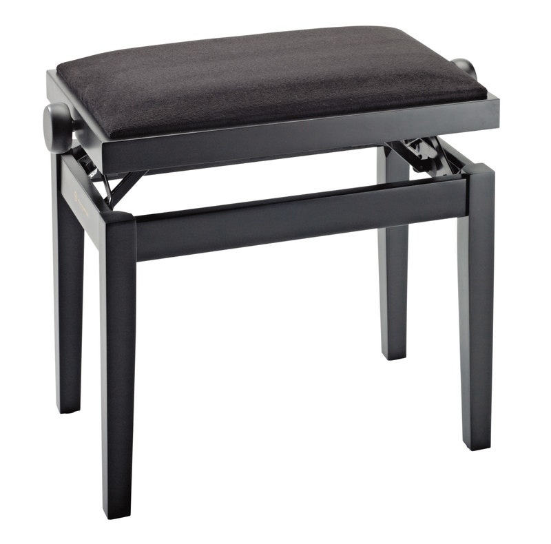 Fullstendig piano benk av solid europeisk bjørketre, lakkert med fire lag svart matt polyester finish. Stabile bein med non-slip gummihettendeler. Dobbelt kryssbarmekanisme for enkel og nøyaktig justering av høyden. Kraftig sittepute laget av MDF-materiale med svart fløyelstoff. Piano benken leveres flatt og er enkel å montere.