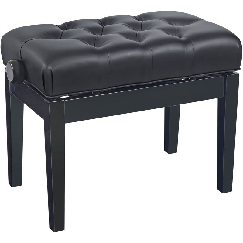 The extremely comfortable piano bench is equipped with high-performance pneumatic gas springs. The continuously adjustable height from 470 to 570 mm is also ideal for use in music schools. The high-gloss black finish and the studded black imitation leather upholstery give it an attractive appearance. Leveling feet ensure a wobble-free and secure stand.