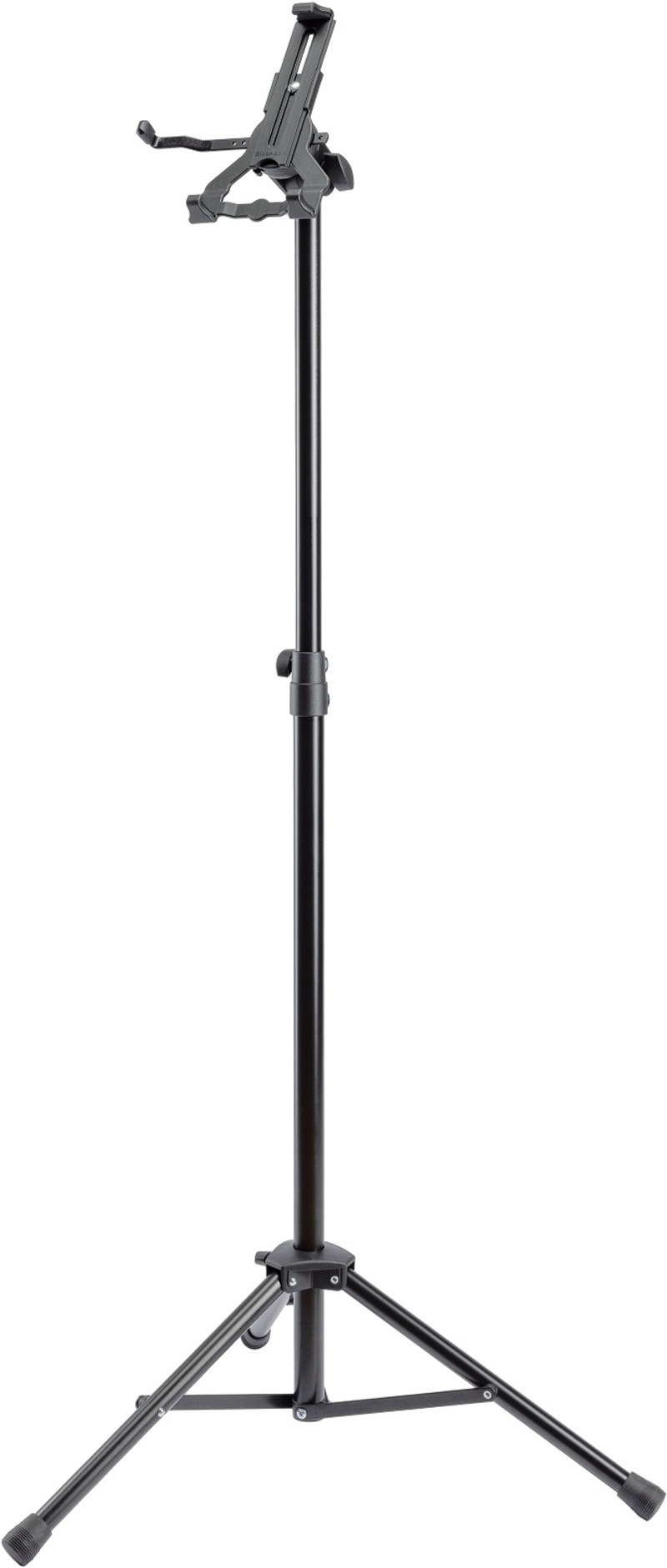 Det robuste nettbrett-stativet fra K&M er spesialdesignet for profesjonell bruk, f.eks. i orkestergraven. Nettbrettfestet er laget av biobasert plast. Disse plastene inneholder en andel på over 50 % opptil 100 % fornybare plantebaserte råvarer. Bruk av fornybare råvarer bidrar til å bevare begrensede petroleumsressurser og redusere skadelige CO2-utslipp. Mer info om biobasert plast på: bioplastic.k-m.de. Holderens klemområde er mellom 158 og 280 mm. Holderen er også spesielt egnet for nettbrett med et beskyttende deksel eller etui opp til 18 mm tykkelse. De overlappende klembakkene med integrerte gummiputer gir et sikkert grep og eliminerer uønskede vibrasjonslyder. Funksjonen til betjeningselementene på enheten er ikke svekket. En justerbar monteringsbrakett med filtpolstring gir ekstra sikkerhet når nettbrettholderen er plassert vertikalt og forhindrer at nettbrettet faller ut selv ved hard bruk. Holderen kan svinges og vippes, slik at hver bruker kan plassere den individuelt. Svingbevegelsen kan justeres fra lett til tøff via en klemskrue. Nettbrettholderen kan roteres mellom stående og liggende format uten videre, slik at uavhengig dreining forhindres. De tre sammenleggbare føttene med en fotavtrykksdiameter på 700 mm gir høy grad av stabilitet med en liten pakningsstørrelse. Den uttrekkbare stangkombinasjonen gjør at stativet kan nå en høyde på 890 mm til 1550 mm.