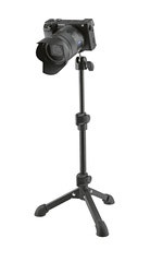Hendig skrivebordskamerastativ for montering av kompaktkameraer, actionkameraer, webkameraer, miniprojektorer og mobile opptakere med 1/4" tilkoblingsgjenge. Kuleledd gjør at det monterte utstyret kan roteres 360° og festes i alle posisjoner. Høyden kan monteres fritt justert fra 280 mm til 488 mm via to klemmehåndtak Vippevinkelen kan justeres trinnløst opp til 90° og bæreevnen er beregnet for utstyr på inntil 1 kg. Stativet kan foldes kompakt for transport eller oppbevaring.