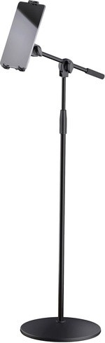 Stabilt nettbrett-/PC-stativ med plassbesparende rund base og bomarm for bruk hjemme, i studio eller på scenen. Basen på 300 mm og 4,5 kg i støpejern gir det funksjonelle stativet et sikkert fotfeste. Med fullt uttrekk pluss vertikal bomarm gir dette en maks. nettbrettstøttehøyde på 1.430 mm. Nettbrettstøtten er laget av biobasert plast. Disse plastene inneholder en andel på over 50 % opptil 100 % fornybare vegetabilske råvarer. Bruk av fornybare råvarer bidrar til å bevare begrensede petroleumsressurser og redusere skadelige CO2-utslipp. Mer informasjon om biobasert plast på: bioplastics.k-m.de. Den universelle nettbrettholderen tilbyr en brukervennlig klemmemekanisme for nettbrett med en størrelse på ca. 10" til 16" i horisontal - og ca. 7" til 13" i vertikal - orientering. Klemområdet er mellom 155 og 307 mm. Holderen egner seg også spesielt godt til bruk med nettbrett med et beskyttende deksel eller etui opp til en tykkelse på 18 mm. De overlappende klembakkene med integrert gummipute garanterer et sikkert grep og eliminerer uønsket vibrasjonsstøy. Funksjonen til betjeningselementene på enheten og nettbrettet (kun stående format) påvirkes ikke. Holderen kan vippes kontinuerlig og, takket være den fleksible bomarmen, lar hver bruker plassere den individuelt.