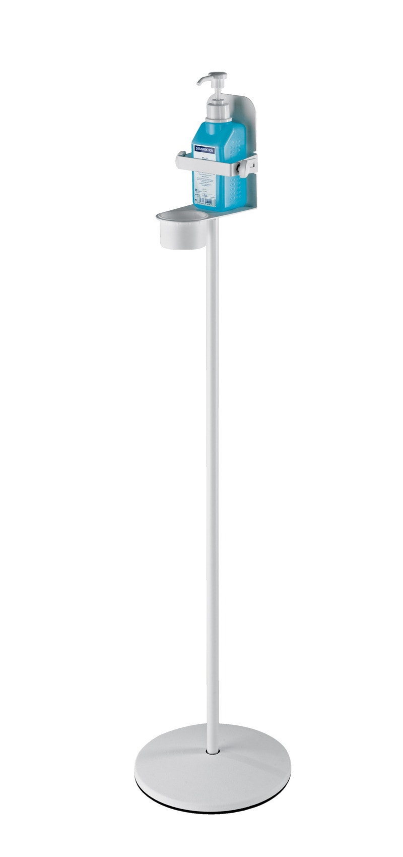 Hvitt pulverlakkert rørstål. Høyde 1 020 mm. Dimensjoner på flaskehåndteringen innvendig 102 x 65 til 102 mm. Med brakett for å feste desinfeksjonsflasken. Plastdryppkoppen kan fjernes for rengjøring. Vær oppmerksom på at stativet ikke er et medisinsk sertifisert produkt. Desinfeksjonsmiddel er ikke inkludert i leveransen.
