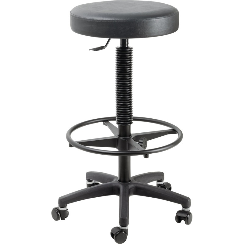 Ekstra høy pall med hjul, rund sitte og stegløs høydejustering med pneumatisk fjær.