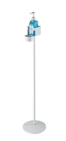 Golvstativ for større pumpflaske med hånddesinfeksjon, rund fot, hvit.
